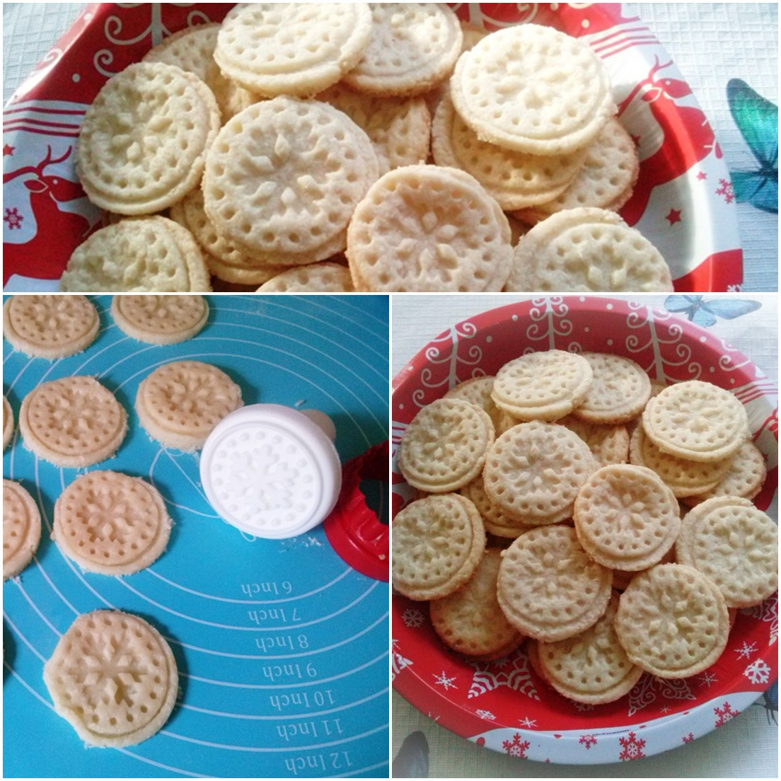 - A sütipecséttel a tésztába nyomjuk a hópehely mintát, majd pogácsa szaggatóval kiszaggatjuk a kekszeket.